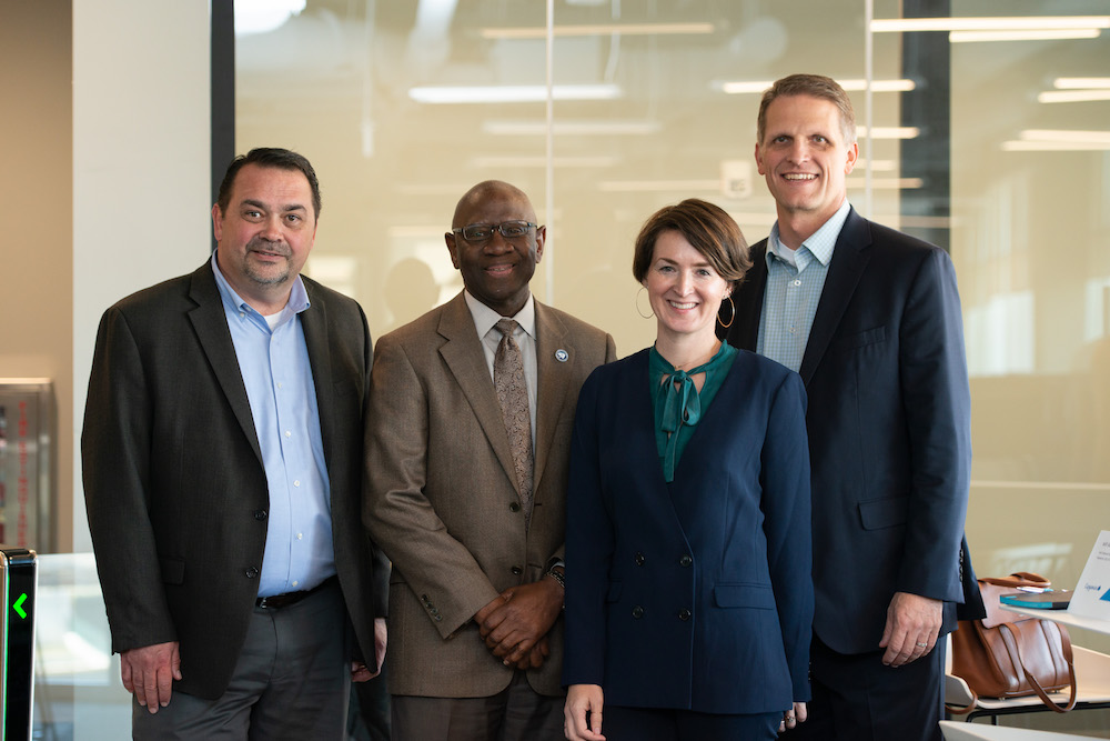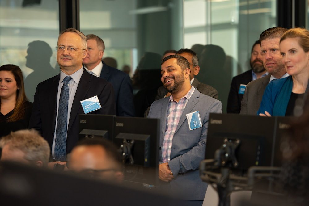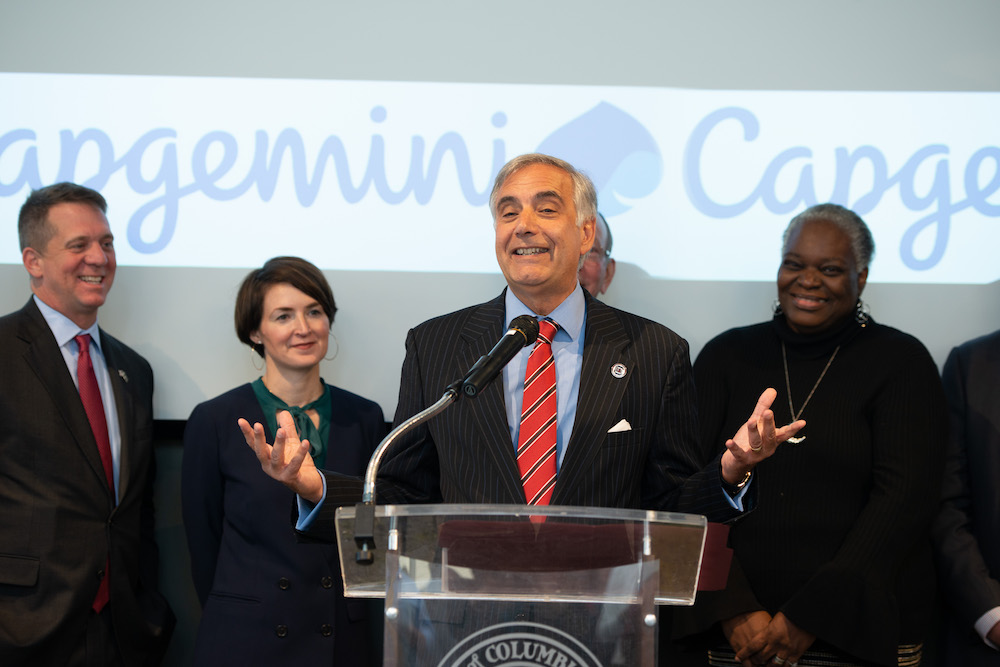 At the ceremony held inside the SOC on Dec. 5, 2018, a crowd of dignitaries, community leaders, Capgemini leaders and employees gathered for remarks by University of South Carolina president Dr. Harris Pastides; Columbia Mayor Steve Benjamin; Capgemini North America Director of Communications Terri Hickey; and John Mullen, member of the Group Executive Committee and President of the North America Business Unit at Capgemini. Teresa Powers was on hand from the S.C. Department of Commerce to present a gift to Capgemini’s Mullen, with words of welcome to the firm from the State of South Carolina.